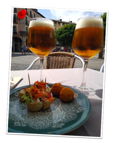 Se encuentra en la Plaza Mayor. También puedes elegir entre comer dentro o fuera del local. Nosotros nos quedamos en la terraza con vistas a la Catedral y comimos de lo más bien. Pretendíamos tomar una cervecita e irnos a buscar un restaurante, pero vimos la carta… ¡Y nos quedamos!