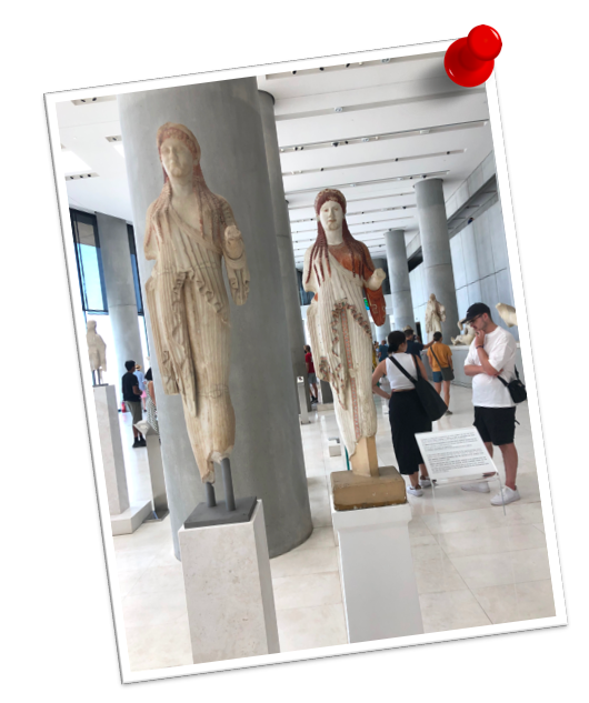 Entre las estatuas expuestas, resaltan las Kores. Se trata de estatuas que se ofrecían a la diosa Atenea para complacerla. De ahí que el rostro de las Kores sean más dulces 🍭 y se les dibuje una pequeña sonrisa.