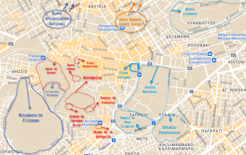 Este itinerario esta diseñado para visitar la ciudad de Atenas en tres días. En el mapa 🗺️ resumen se puede ver en azul oscuro los lugares del primer día 1️⃣, en rojo los del segundo día 2️⃣ y en azul claro los del tercer y último día . Los lugares indicados solo con flechas se debe a que no cabían en el mapa (no están lejos realmente). El último color que deberás tener en cuenta es el naranja, pues es el hotel 🏨 que elegimos.